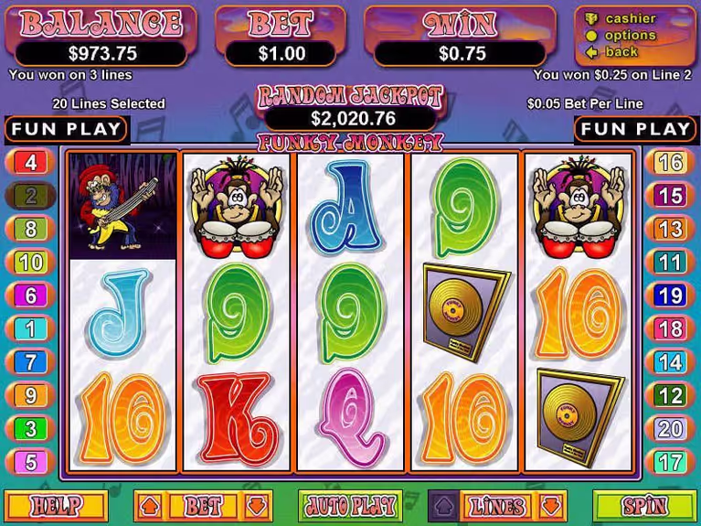 If you feel like a bit of a groove, Funky Monkey is the game for you, the cool tunes and graphics will have you spinnin away all day! This twenty-payline game is also perfect for those who want to win some real cash prizes or simply enjoy free credits as it offers both and it's so easy to bet. So wait no longer and join the Funky Monkey for a little guitar and drum sesh.
